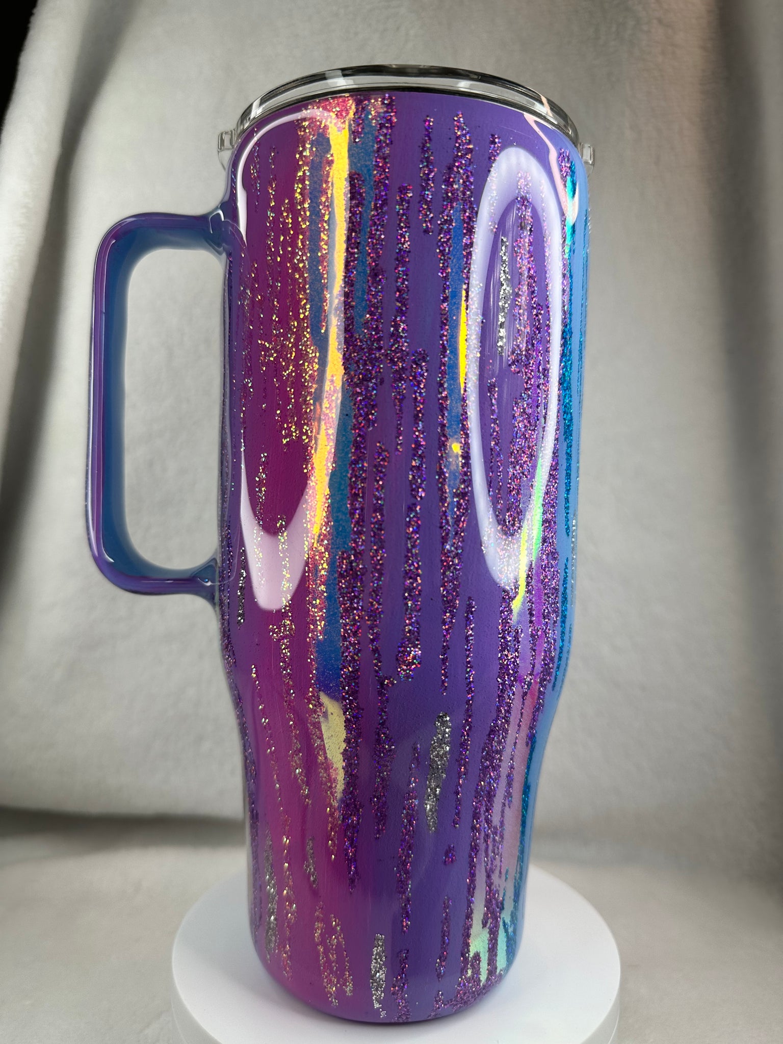 Acrylic paints, opal vinyl and glitter.